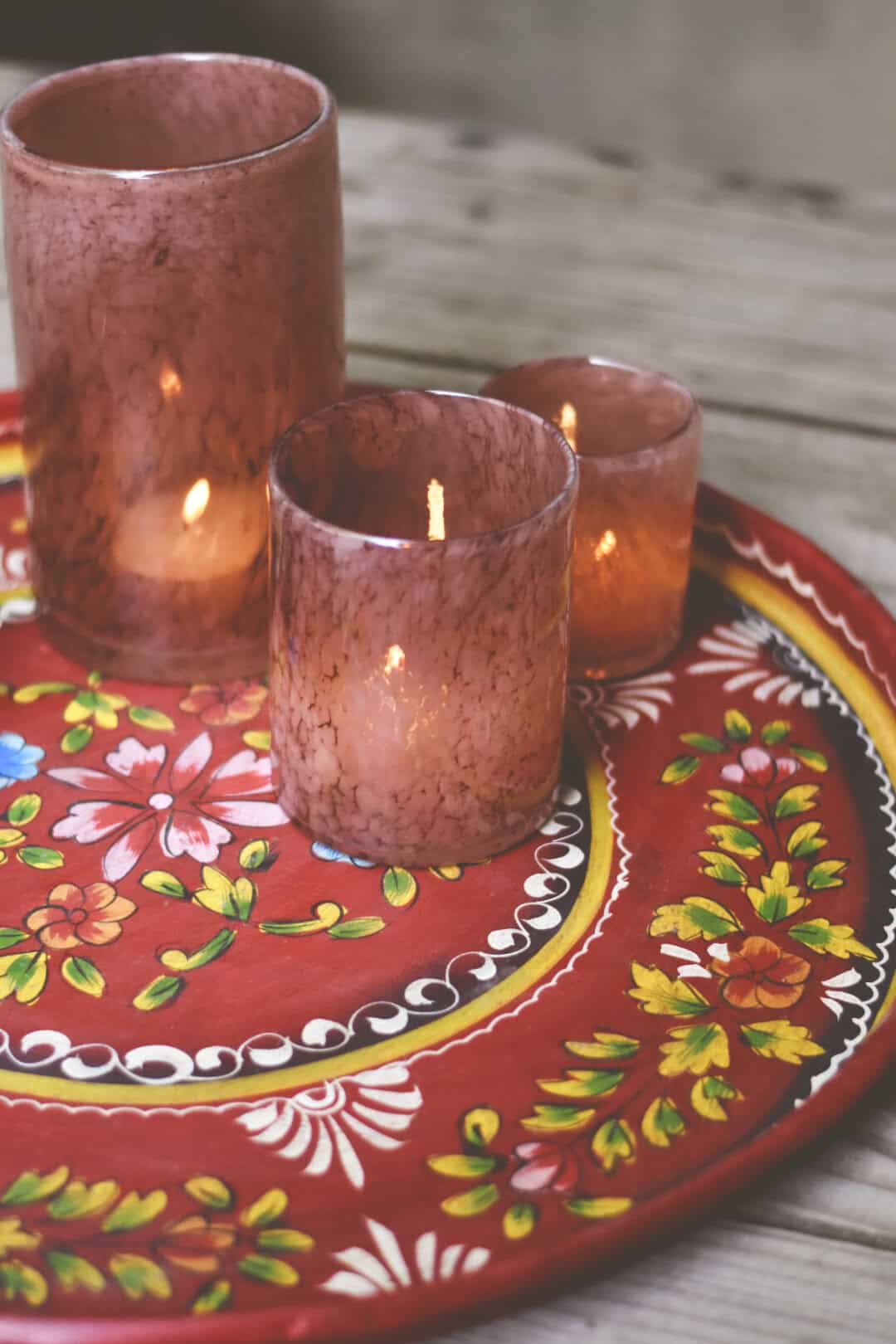 Håndmalte fat i metall.