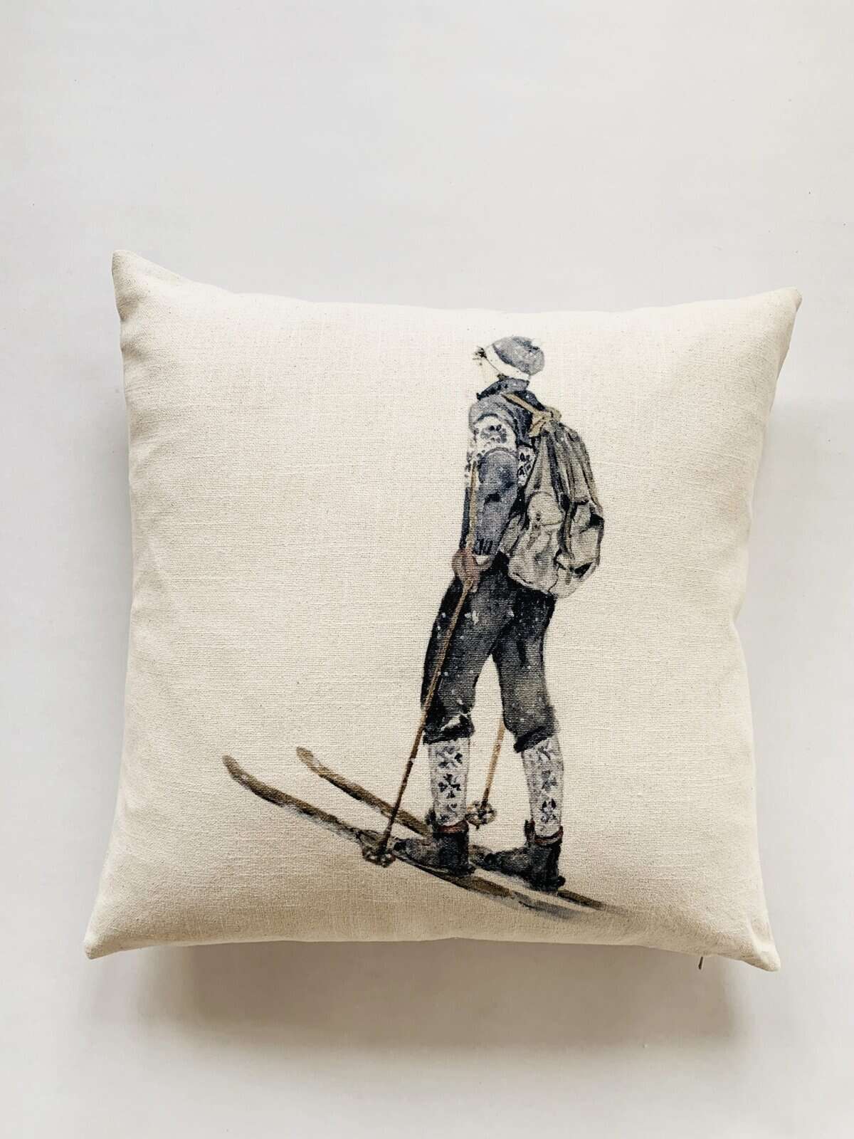 Putetrekk 50×50 cm Gabriel på ski Akvarell malt av Anita Sletten Nordicwild