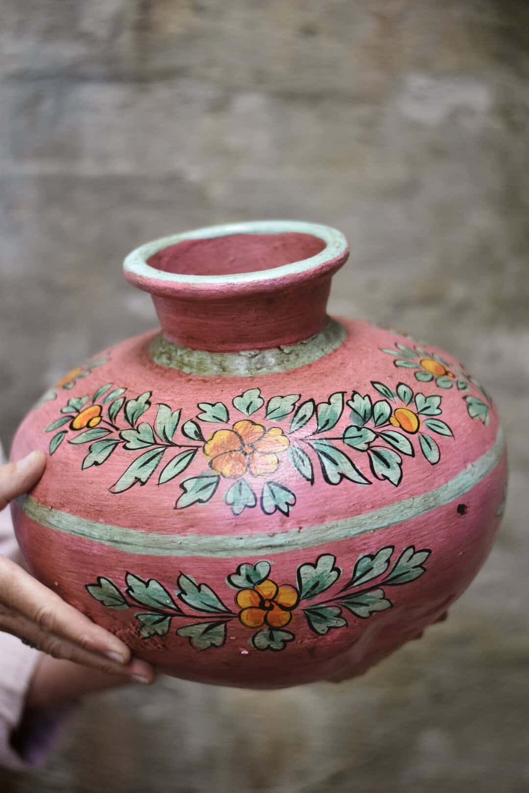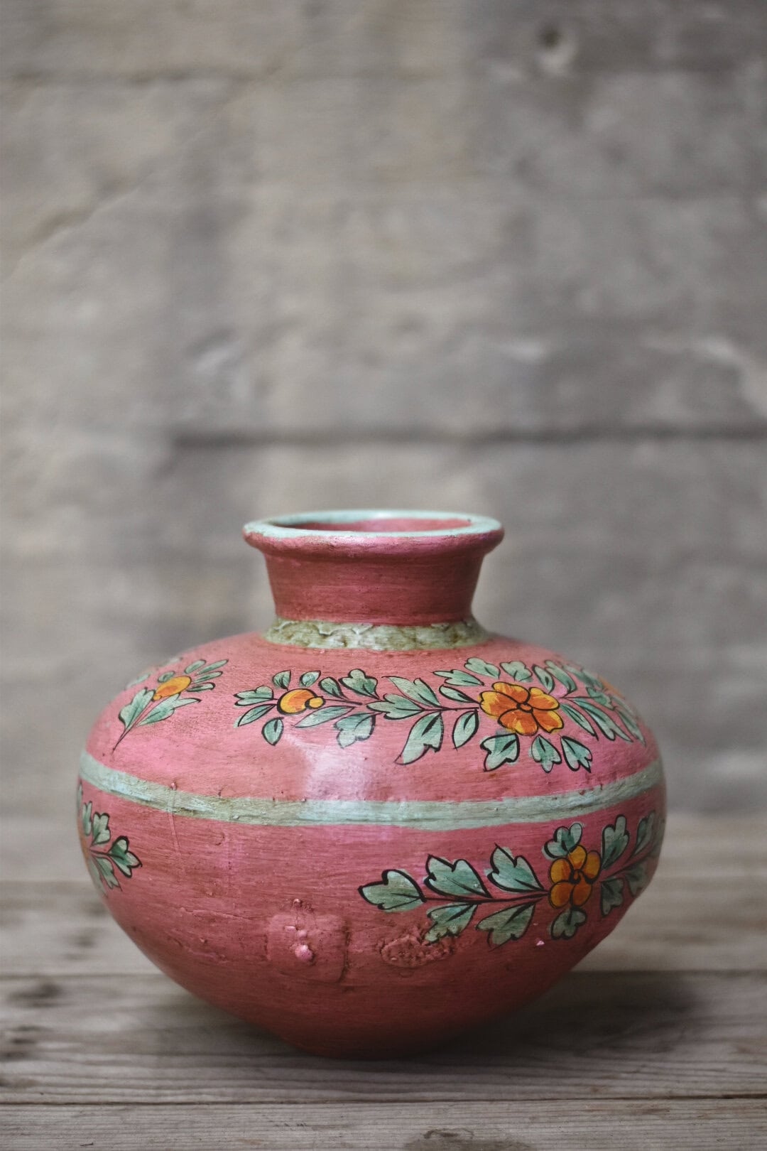 Håndmalt potte i metall m rund bunn d:35/h:30cm
